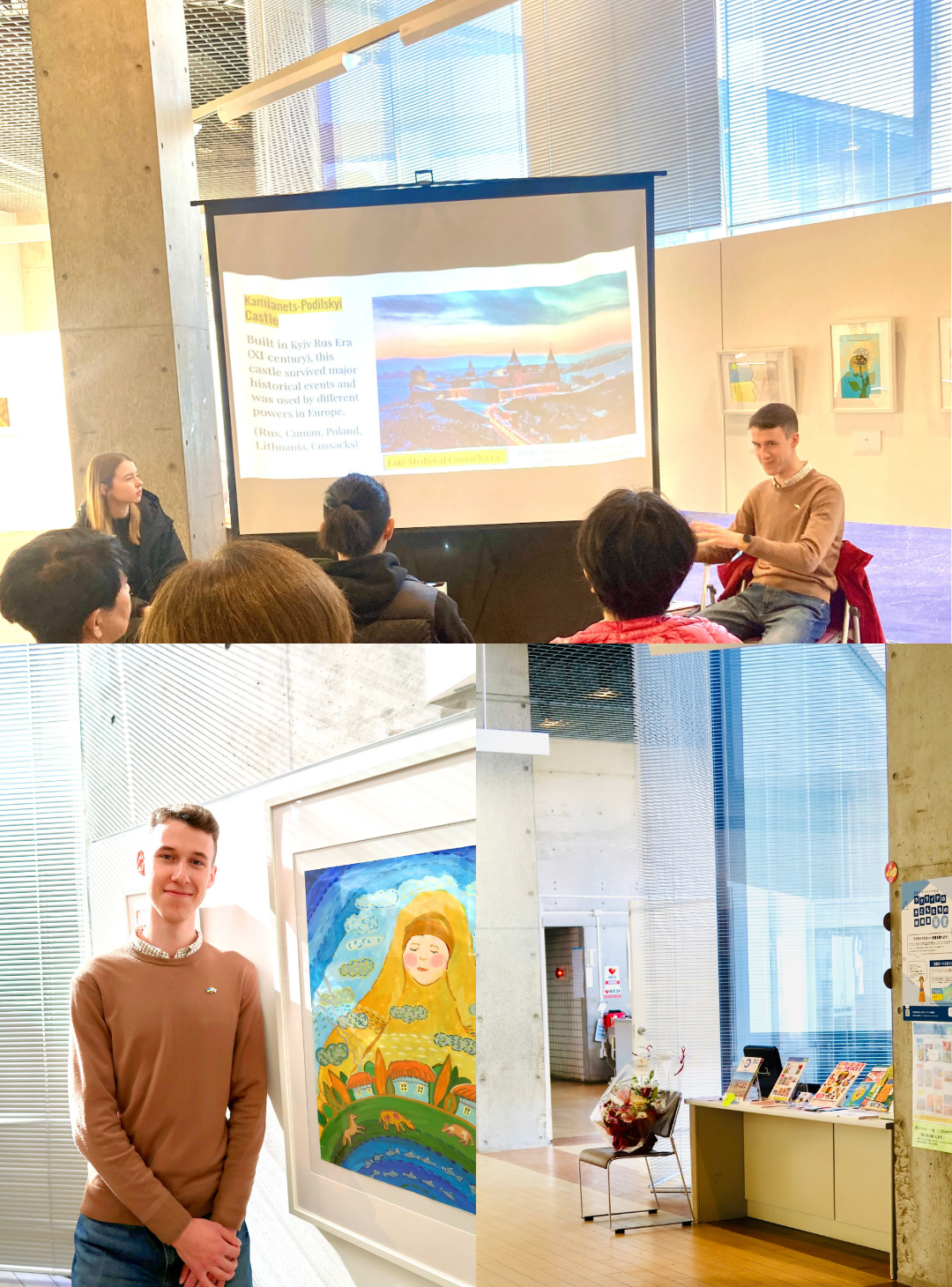 本学ウクライナ人留学生、トロプチン・二キタ君が登壇した「トークイベント」が開催されました。イベントでは、ウクライナの歴史や文化、ウクライナ戦争の現在について語りました。取材に訪れた記者の問に対し、母国にいる家族への思いや、日本の支援へ感謝の言葉を述べました。